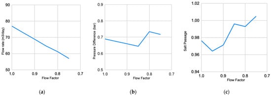 Effects of flow factor variations. (a) Normalized permeate flow; (b) normalized differential pressure; (c) normalized salt passage.