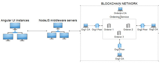 Figure 1 shows the proposed architecture. This network consists of three organizations, each with a peer node (the one in charge of hosting a copy of the ledger and updating it) and an associated certificate authority. To manage the network communication and to build and distribute the transaction blocks, a cluster of orderers was implemented, with a certification authority independent of the organizations associated to this cluster.
