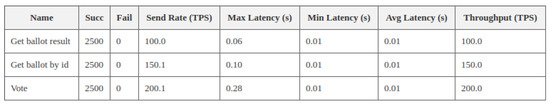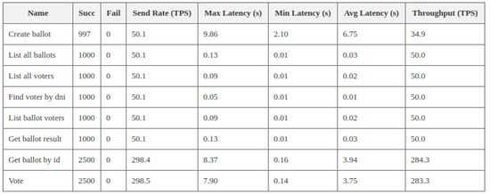 Analyzing the performance metrics shown in Figure 2, it is worth noting the low latency of the blockchain read operations and the high transaction load supported by the vote casting and total vote listing operations.