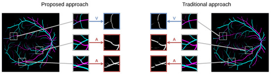 Figure 2 shows the details of the arteries, veins and vessels segmentation maps of the same retinography predicted by a model trained using the MS and the traditional approaches.