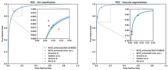 - Ma, W.; Yu, S.; Ma, K.; Wang, J.; Ding, X.; Zheng, Y. Multi-task Neural Networks with Spatial Activation for Retinal Vessel Segmentation and Artery/Vein Classification. In Medical Image Computing and Computer Assisted Intervention—MICCAI 2019; Shen, D., Liu, T., Peters, T.M., Staib, L.H., Essert, C., Zhou, S., Yap, P.T., Khan, A., Eds.; Springer International Publishing: Cham, Switzerland, 2019; pp. 769–778. [Google Scholar] [CrossRef]