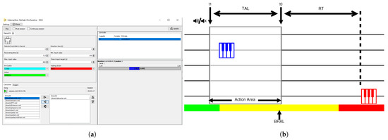 IRO (https://github.com/manmermon/IRO, accessed on 22 July 2021) is a cross-platform software, developed using Java technology (version 1.8) under development but in a sufficient state so that it can be used by potential users. In this multiplayer musical game, based on midi files, the player must perform a movement when the avatar reaches a certain area. Missing actions mute the melody for a while. Therefore, the players are responsible for the correct sounding of the melody. IRO contains three parts: the video game itself, the controller or the user interface, and the therapist interface. As players’ motor skills can be very different, IRO does not set any default controller.