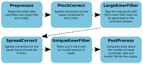 With this work, we are proposing a parallel tool able to process input FASTQ reads, an extended unaligned sequence format, also supporting the specific format internally used by CloudEC. The overall workflow of the tool can be decomposed in the six phases shown in Figure 1, which basically consist of: two mandatory stages at the beginning and the end of the pipeline to preprocess the input and format the output, respectively; two error correction phases that implement different algorithms each one; and, finally, two filtering stages that are able to tag the input reads with auxiliary information for the error correction phases. This processing pipeline is also used in the original CloudEC tool, which has served as the underlying baseline for our Spark-based implementation.