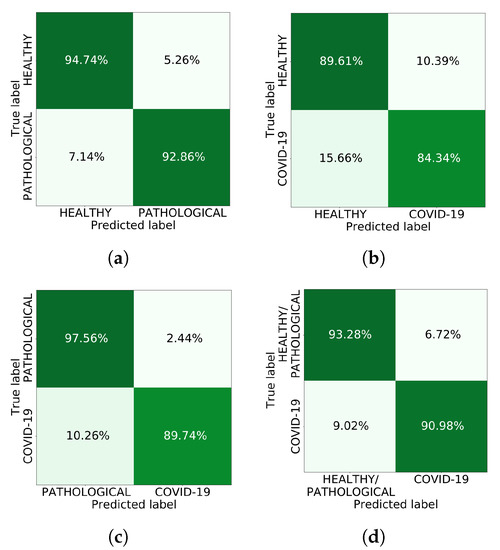 Confusion matrices for the four conducted experiments. (a) 1st experiment (Healthy vs. Pathological); (b) 2nd experiment (Healthy vs. COVID-19); (c) 3rd experiment (Pathological vs. COVID-19); (d) 4th experiment (Healthy and Pathological vs. COVID-19).