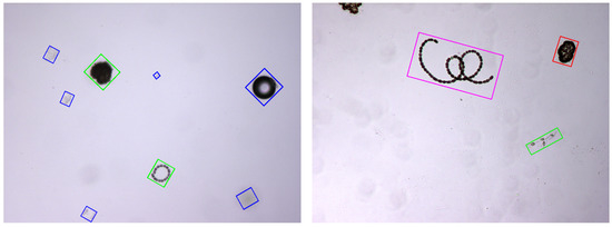 Examples of phytoplankton detection (left) and species classification (right). In the left image, true positives are represented in green and true negatives in blue. In the right image W. naegeliana in red, A. spiroides in magenta and D. sociale in green.