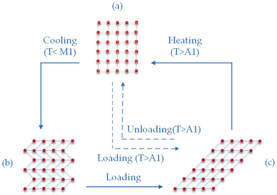 The martensite–austenite transformation of the SPF is shown in Figure 2 [14]. The geometric shape of the metal element in its austenitic state (Figure 2a) is the so-called “remembered” or “trained” shape. Upon cooling below a certain temperature, the alloy transitions to the martensitic phase. If no stress is applied to the alloy during cooling, its macroscopic structure remains unchanged. The atoms in their crystal lattice acquire a different (mirror) orientation—“twinning martensite” (Figure 2b). With a small stress applied to this crystal structure, the so-called “deformed martensite” is obtained (Figure 2c). Heating the deformed martensite above the austenitic transformation temperature leads to the reversion of the deformed martensite back into austenite.