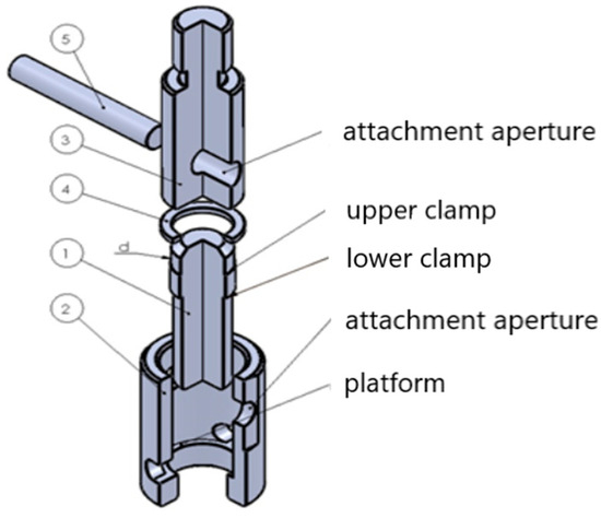 For conducting the experimental study, a clamping device shown in Figure 5 was designed and manufactured. It consisted of a lower clamp 1, transitional clamp 2, upper clamp 3, ring 4, and pin 5.