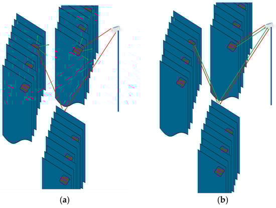 Comparison of omnidirectional and retrodirectional answers of the interrogated tag arrays: (a) the tag array response to omnidirectional radiation; (b) the tag array response to retrodirectional radiation.