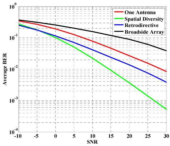 Note that for BER = 10−2, the retrodirective array provides a ~6 dB gain compared to the one-antenna case. The respective gain for the spatial diversity case is theoretically higher but cannot be attained since the incident signals to the different antenna elements are correlated. The broadside array performs badly. The stated results indicate that the retrodirective array has an increased operation range compared with that of the conventional tag. Indeed, to quantify and intuitively present the attained results, let us adopt the easily understood and widely accepted backscatter communication radio link budget formula from [18], which is as follows: