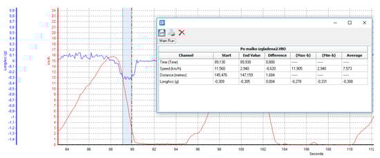 The results of the conducted research were processed with VBOX Tools software. In Figure 1, a portion of a real recording of the acceleration and velocity variation of a Cross Fusion bicycle is presented, and the additional Main Run window, through which the results for the minimum, maximum, and average acceleration values for the particular trial were processed.