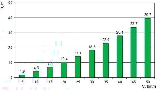 The results show a variation in stopping distance from 1.9 to 39.7 m for the speed limits studied. For the specific conditions, for every 5 km/h increase in speed, the length of the braking distance changes from 2.4 to 6.0 m.