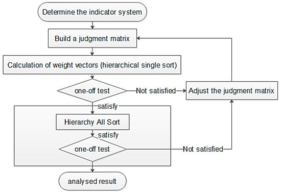 AHP mainly breaks down the influencing factors always related to decision-making into a target layer, criterion layer and scheme layer, hierarchizes and digitizes the influencing factors, and conducts qualitative analysis on this basis. Here is a detailed analysis of the analysis process of the analytic hierarchy process, including construction model and algorithm demonstration and MATLAB programming [6,11,13]. The analytical flow chart of analytic hierarchy process is presented in Figure 5: