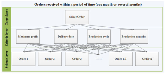 Criteria layer: Factors that influence decision-making include the maximum profit value of a single order, delivery date, and production cycle and production capacity;