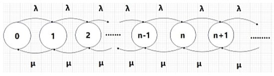 The inflow rate in each state is , that is, the arrival rate per workpiece is . Because there is only one workbench, the workpiece departure rate in each state is also equal to the average service rate , so as to solve the equilibrium equation of the state. The equilibrium equation of states is that in any state, the total inflow rate of state n is equal to its outflow rate.