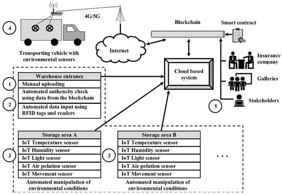 Most of the world’s artworks remain in hiding, taken away with care to special warehouses (WH) or rooms. A very small part—only between 2% and 8% of the entire collection—is located at big museums []. They still face hard challenges versus traditional, very first-level administration systems in the storage of unique paintings or collector items. Critically, the requirements of such warehouses are to safeguard the articles, maintain their condition, and lastly, check their authenticity and origin. Technology provides some promising solutions to these challenges. From this perspective, blockchain technology is secure and transparent, and it might, therefore, give a seemingly immutable record of transactions and movement of goods in and out of the warehouse. The authors’ idea is based on the use of blockchain with real-time tracking capabilities, constant monitoring of the environment by IoT sensors, and effective RFID technology; the result would be a very secure system that could be beneficial for the management of these valuable pieces (statues, sculptures, and collectible items) in warehouses and museums belonging to art galleries.