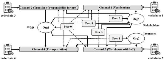 There are three participants (organizations): Org1—warehouse management system; Org2—stakeholders, which include artwork owners and galleries; Org3—insurance companies. The solid arrows represent the organizations’ access to data in the respective channels. The dashed arrows represent peers’ read/write operations on the channels.