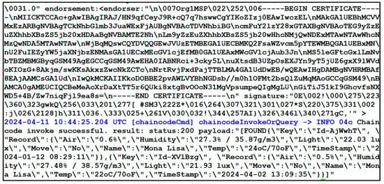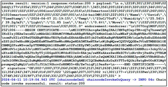 Testing the functionality of chaincodes implementation is performed by an administrative docker container with a command line interface. It is used for sending requests to smart contracts. In Figure 5 is shown a request for creating a record in Channel 2 due to periodic reporting of the environment conditions of an object from the IoT sensors in the warehouse. The information includes the time of the report, the name of the object and the values of sensor indicators.