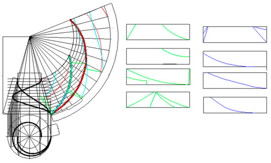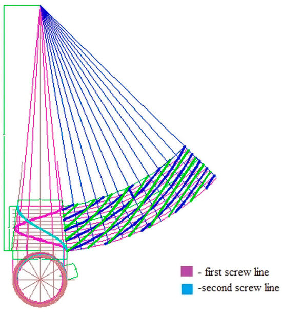 A graphical experiment was conducted to explore the direction and the extent to which the dimensions of the intrinsic components influence expansion when their width is smaller than that of the surrounding surface. To that effect, identical helical lines were constructed on the same surface but offset at a distance of 650 mm. The components themselves were placed on metal sheets of the same size, using criteria consistent with the previous setup. The positioning of the metal sheets is indicated on the expansion itself, allowing for more efficient use of the sheet material with less manufacturing waste, a smaller number of details, i.e., 8 and 7 pieces, respectively, a significantly reduced length of the shear, and a shorter auxiliary and preparatory time required for the manufacturing of the details. Established for comparative purposes are the lengths of the shear only along the contour line of the details cut off from the full width of the sheet for half and one pitch, respectively. Thus, the and , and if the shearing is along a bandwidth of 0.6 m, then the and , sequentially.