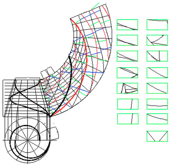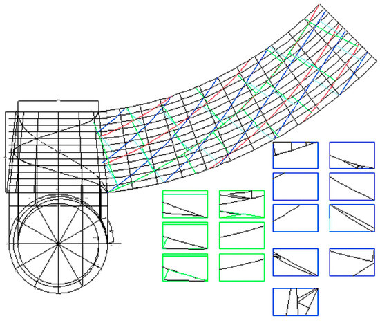 In this case, the number of details is nine, of which eight are identical with area , and one with area . The length of the shear line is . The length of the shear line in Figure 6 is 33.4% shorter than in Figure 3, and 20.8% shorter than in Figure 4. The number of surface elements in Figure 7 is only 69.4% of the number of elements in Figure 3 and almost the same as that of the elements in Figure 4. A great advantage of the approach to obtaining the surface of Figure 6 is that all elements are the same except for one, while in Figure 3 and Figure 4, all elements are different.