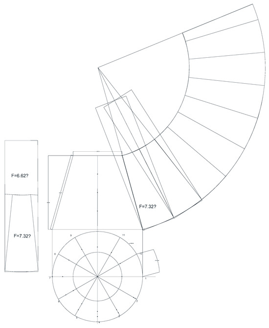 In the manufacture of sheet material details for various purposes, such as transforming sections for dryers, steel elements in fire-fighting equipment, adaptors of the same shape but different size, different types of hoppers, auger housings, industrial cyclones, fans, pipelines of various cross-sections, parts of equipment and facilities for the needs of agricultural production related to the processing of agricultural produce, cyclones and water towers, determining the lines of mutual intersection of their component parts is a critical task during the design phase [20,21]. Determining the necessary amounts of production materials for machinery and equipment featuring predominantly sheet metal components is vital for single and small-scale production [22,23,24]. The shapes of these technical products are created by combining different geometric solids or parts thereof obtained by their mutual intersection. The intersection of these components of space (surfaces) with each other occurs in planar or spatial curves known as surface sections. Identifying them is crucial for the practical implementation of these products. To obtain them, it is necessary to locate the lines of intersection in order to derive the shapes and dimensions of the surfaces. This is accomplished by constructing the expansions of these products.