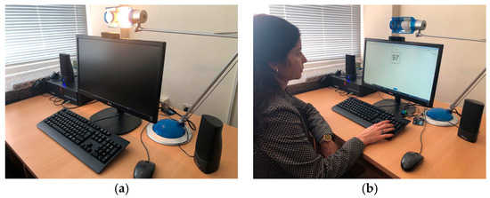 The data collection setup consists of a desktop PC running the above-mentioned web application, equipped with a 24′ monitor with a TRUST web camera mounted on top, a set of stereo speakers, placed from both sides of the monitor, and an adjustable 220 V desktop lamp, controlled by an Arduino controller through a relay. The setup is presented in Figure 1.