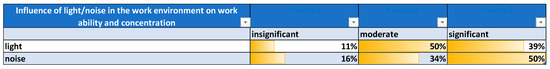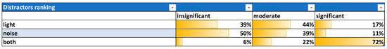 Figure 4 and Figure 5 depict the post-test perception of these parameters, respectively, as a ranking of light/noise/both context states (Figure 4) and as the perceived degree of influence of each one of them on the participants’ performance (Figure 5).