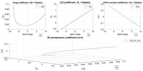 In Figure 2 are shown the aerodynamic coefficients of the forces and moments (taken from XFLR5) in the longitudinal movement of the UAV as a function of the angle of attack (α) and a constant cruise speed V. This is performed in the vertical plane of the flight, where the landing also takes place. In addition, this figure shows the 3D relationship of the determined coefficients.