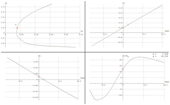 The pitch moment graph Cm = f(α) is important for the balancing of the aircraft and its static stability. In this case, from Figure 3 it can be seen that the designed aircraft is balanced in the longitudinal plane and is statically stable—Cm decreases with the increase in α, changing its sign. It follows that no additional balancing is needed, which can be accomplished by moving the individual weights in the aircraft, creating a V-shape on the wing, or deflecting the control surfaces to the appropriate position.