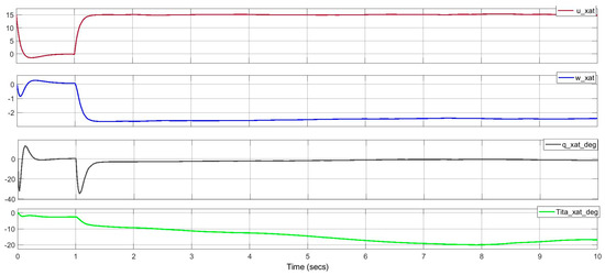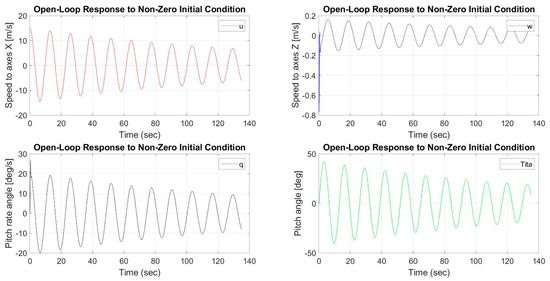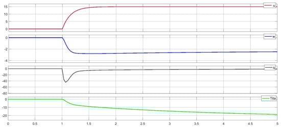 The longitudinal movement of the UAV is characterized by two separate modes: symmetric phugoid and symmetric short period modes [16] in the vertical plane. Generally, in a short periodic movement of the UAV, it is stable with the complex conjugate roots to the left of the imaginary axis. However, the movement remains oscillating. In Figure 4 are shown the state vectors of the UAV in the long periodic motion with symmetric phugoid modes. The response of the system when given an input signal [15, 0, 0, 0] is determined in the MATLAB programming environment.