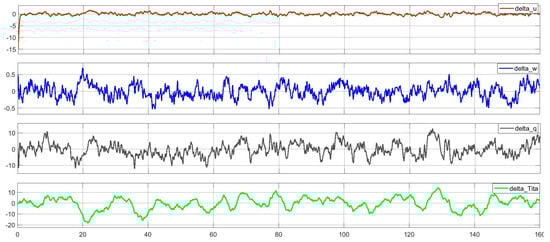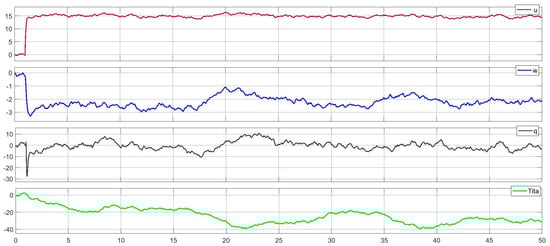 Measurement noise is a faithful companion of any technical system. For its modeling, the experimentally recorded characteristics of the GY91 board are used. After that, the information from sensors of the measurement complex of the UAV are modeled and, through calibration formulas, the readings for the individual flight parameters in the longitudinal direction were taken. The modeling results in the longitudinal motion, along with the UAV control algorithm and all the system channel disturbances, are shown in Figure 6.