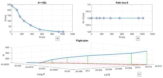 Table 2 shows a developed engineering flight plan including the set altitude “H (m)”, the length of the road between the individual stages of landing “S (m)”, the speed along the glide path “u (m/s)” and the geographical coordinates of the individual stages of the landing, “B (deg)” and “L (deg)”.