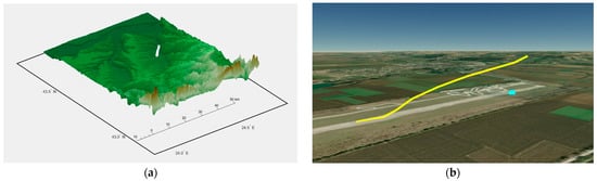 After construction of the engineering flight navigation plan, the created glideslope and track line is played on the operational quadrant of a digital aeronautical map, as shown in Figure 9a. The entire landing plan is visualized in Figure 9b.