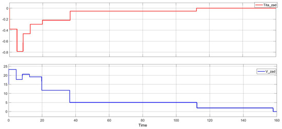 To ensure the landing stage, an algorithm was developed that takes into account the flight speed and the distance traveled. This algorithm is based on the engineering flight navigation plan shown in Table 2. Through it, the control effects in terms of speed and pitch angle are provided so that it is possible for the UAV to follow a precisely set glide path during the landing trajectory. The graphs of the control signals for the pitch angle and the linear speed, respectively, are shown in Figure 12.