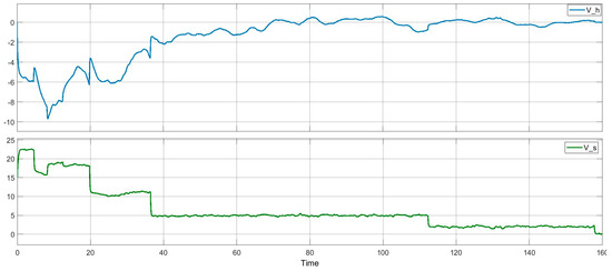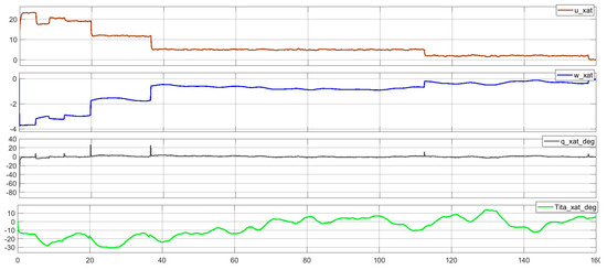 The rudder release signal is set according to the values of the control effects, which are determined within certain safe limits and norms for the indicated rudder operation signals for pitch and engine thrust. The vertical operating speed of the flight and the horizontal speed on the path to the bearing point in the strip are shown in Figure 13. From Figure 14 for the UAV state vector, it can be seen that even with strong atmospheric fluctuations or measurement noise, the LQG algorithm performs well.