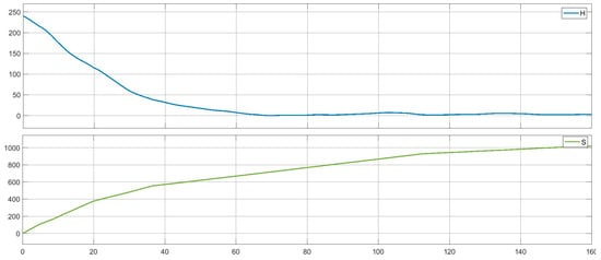 The landing of the UAV in a windy turbulent atmosphere with sensor noise is shown in Figure 15. This figure shows the change in flight altitude when traveling the required distance to the landing strip, when the UAV touches down at the point on the ground surface and then when it goes to the set point.