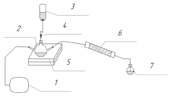 Laboratory experimental setup: 1—air supply compressor; 2—three-neck flask; 3—container with hydrochloric acid solution; 4—dispenser; 5—magnetic stirrer; 6—adsorber; 7—receiver flask with adsorbing solution.
