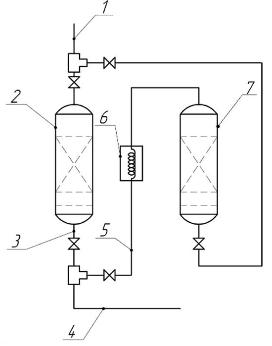 For the purpose of the industrial use of the proposed adsorbent, a technological scheme of an adsorption unit was developed as shown in Figure 2. The technological scheme includes a purified gas supply system and two adsorbers, in one of which (labelled “2”) the adsorption process takes place, while in the other adsorbent (labelled “7”), the regeneration process takes place; purified gas is output via line 3, purified gas is supplied to the power plant via line 4, and the gas is supplied for sorbent regeneration via line 5 through heat exchanger 6 (label numbers as in Figure 2). The composition was regenerated with a 4% sodium hydroxide solution and purged with hot (400 °C) fuel gas purified from sulfur compounds.