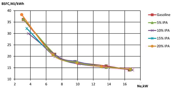 The results for brake specific fuel consumption (BSFC) obtained by addition of isopropanol and gasoline are shown in Figure 2.