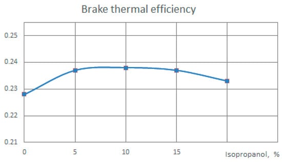 A higher effective efficiency means that the engine is operating more efficiently and there are lower losses in the engine when using energy from the fuel to generate mechanical power. The factors that affect the effective efficiency of an engine are the design features of the engine, the way the fuel–air mixture is mixed, the combustion process, and the mechanical and thermal losses. The results for brake thermal efficiency obtained by addition of isopropanol and gasoline are shown in Figure 3.
