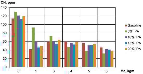 The results for CH emissions obtained by addition of isopropanol and gasoline are shown in Figure 4.