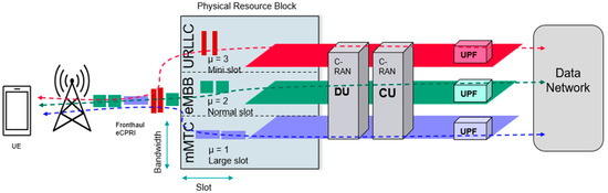 Network slicing aims to provide customised communication services for different usage scenarios. For example, one slice can be reserved for high-speed data transfer, while another slice can be reserved for applications that require low latency. With network slicing, service providers can flexibly and quickly deploy their applications and services to meet the specific requirements of different services [13]. Partitioning a single physical network into different logical networks, customised according to different unique requirements, has emerged as a promising approach to meet such diverse requirements in a sustainable manner [14]. Figure 1 shows the 5G architecture by end-to-end network slices, including the physical layer.