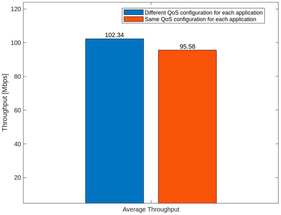 According to the simulation results, when different QoS is assigned to each flow of six UEs, the average throughput is measured as 102.34 Mbps. When the same QoS is assigned to these flows, the average throughput is measured as 95.58 Mbps. The impact of QoS types on throughput is shown in Figure 4. Analysing the simulation results obtained, it can be seen that to implement RAN network slicing, it is necessary to use QoS algorithms specific to each network slice to meet the requirements of different application characteristics.