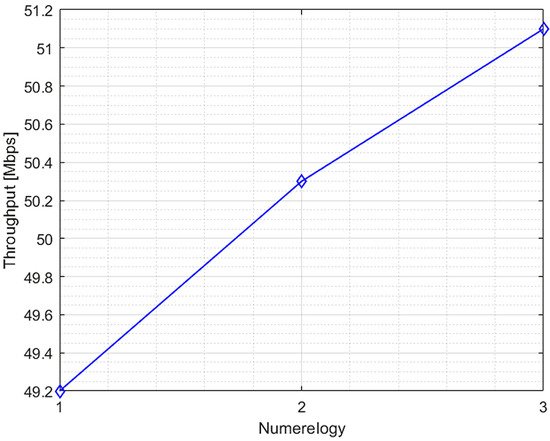 In the simulation environment, when the throughput was tested with numerology type 1 at 100 MHz bandwidth, the average throughput was 49.2 Mbps, when tested with numerology type 2 it was 50.3 Mbps and when tested with numerology type 3 the average throughput was 51.1 Mbps. In theory, it is known that the slot becomes narrower as the value of the numerology type increases. Accordingly, the data rate per unit of time increases. Figure 7 shows the effect of changing the numerology on the throughput according to the simulation results obtained. In this case, it has been shown that for the implementation of RAN network slicing, methods must be developed that use numerology that is specific to the network slice.
