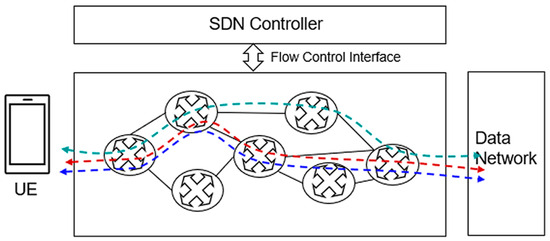 Figure 8 shows the SDN network topology created using virtual switches (Open vSwitch, OVS) [20] on the Mininet. The inter-switch bandwidth in the topology is 100 Mbps. Flows 1, 2 and 3, which are assumed to be initiated by the UE, represent the data flows sent to the data network through the transmission network in the 5G architecture, as shown in Figure 2. Virtual switches in the transmission network are connected to the SDN controller via the flow control interface. The traffic characteristics in the test scenario created for verification are shown in Table 5. The expected data throughput is 50 Mbps for game traffic in Flow 1, 10 Mbps for video traffic in Flow 2 and 50 Mbps for HD video traffic in Flow 3 on the test servers located on the data network side.