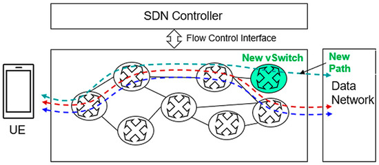 In an SDN–NFV network, virtual switches are considered as VNF in NFV architecture [21]. In this study, a dynamic network resource scaling method based on SDN–NFV is proposed in case of congestion in the 5G transport network, as shown in Figure 2. The activity diagram of the developed SDN–NFV algorithm is shown in Figure 9.