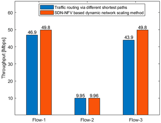 In the simulation environment, flows were started simultaneously according to the traffic characteristics in Table 5. After a while, it was observed that the data transfer rates decreased and network congestion occurred. Initially, in the event of network congestion, routing was performed through different shortest paths using the Dijkstra algorithm through the SDN controller without scaling. Using this method, the average data rates at the receiver were measured to be 46.9 Mbps for Flow 1, 9.95 Mbps for Flow 2 and 43.9 Mbps for Flow 3 per stream. When this method is evaluated in terms of performance rate, it can be seen that the expected throughput values at the receiving end are achieved by 93.8% for Flow 1, 99.5% for Flow 2 and 87.8% for Flow 3.
