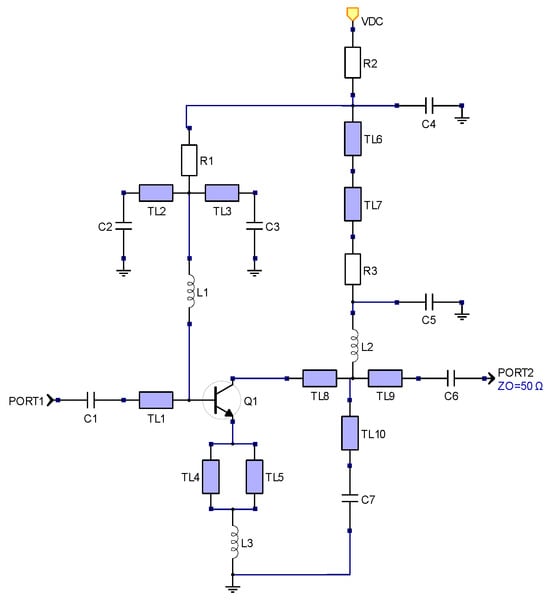 Initial schematic of the designed RF amplifier for the range 100–500 MHz.