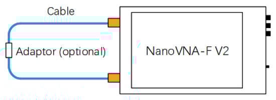 In all cases of the S-parameter measurements of two-port DUT, an additional procedure for calibration, called “through”, is performed before the measurement. It directly connects Port 1 to Port 2 by a pair of cables, connected by a right connector, as shown in Figure 3, or by a benchmark coaxial single cable.