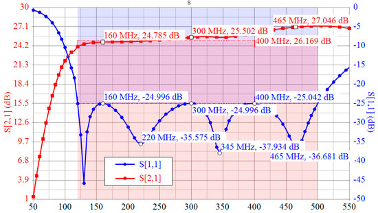 The initially designed RF amplifier is simulated and the S-parameters matrix is derived using the functionalities of the simulation platform. The next step is to set criteria for optimization concerning the performance of the amplifier in the desired frequency range of 100–500 Mhz. Two limit levels of scattering parameters S11 (input reflection coefficient) and S21 (coefficient of transmission) are expressed by a system of two equations S11 < −25 dB and S21 > 25 dB. A new simulation is started that follows an integrated algorithm for optimizing the performance of the amplifier over the selected band. This is done by an automated process of a step-by-step series of changing particular element values in the schematic and calculations of S-parameters and others.