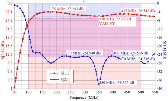Figure 6 shows the results of optimization after the impedance matching upgrade and the overall performance of the RF amplifier into the set frequency band from an S-parameter perspective.